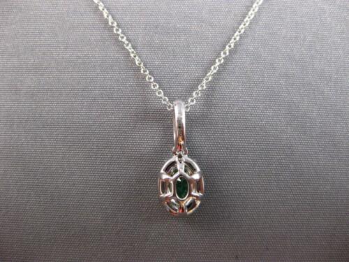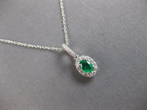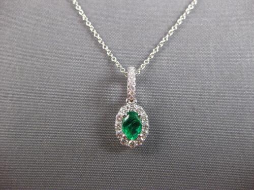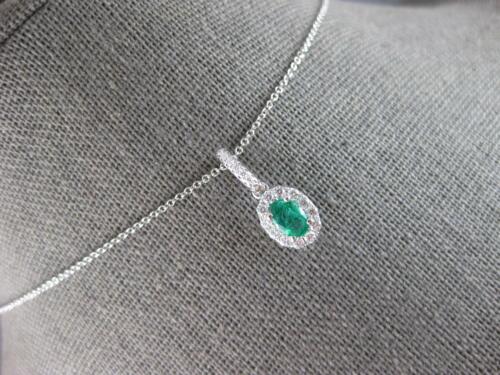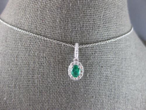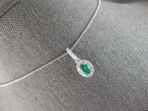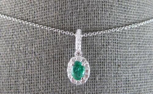 14KT WHITE GOLD FLOATING PENDANT. 3D CLASSIC FLOWER HALO DESIGN. ROUND DIAMONDS ARE F/G COLOR, VSSI CLARITY .22 CARATS. AAA OVAL COLUMBIAN EMERALD IS .34 CARATS. COLUMBIAN EMERALD MEASURES 5.5mm X 4mm. PENDANT MEASURES 17mm X 7mm. COMES ON A 14KT GOLD DIAMOND CUT 18" INCH CHAIN. WRITTEN APPRAISAL AVAILABLE. COMES IN A PRESENTABLE GIFT BOX.