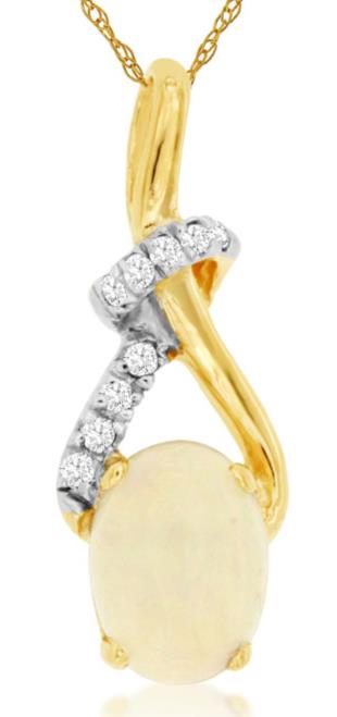14KT YELLOW GOLD FLOATING PENDANT. 3D LOVE KNOT TEAR DROP DESIGN. ROUND DIAMONDS ARE F/G COLOR, VSSI CLARITY .06 CARATS. AAA OVAL OPAL IS .50 CARATS. COMES ON A 14KT GOLD DIAMOND CUT 18" INCH CHAIN. WRITTEN APPRAISAL AVAILABLE. COMES IN A PRESENTABLE GIFT BOX.