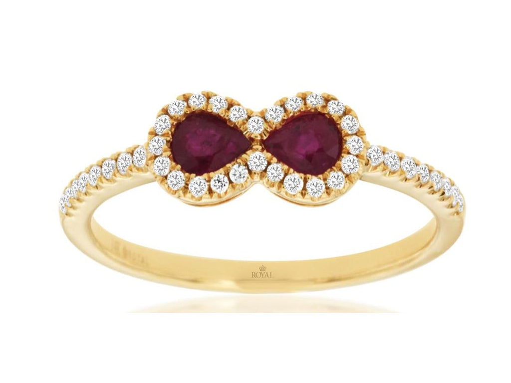14KT YELLOW GOLD LOVE RING. 3D TWO STONE INFINITY DESIGN. ROUND DIAMONDS ARE F/G COLOR, VSSI CLARITY .17 CARATS. AAA PEAR SHAPE RUBIES ARE .39 CARATS. RING SIZE 7. CAN BE SIZED BY OUR MASTER JEWELER UPON REQUEST. WRITTEN APPRAISAL AVAILABLE. COMES IN A PRESENTABLE GIFT BOX.