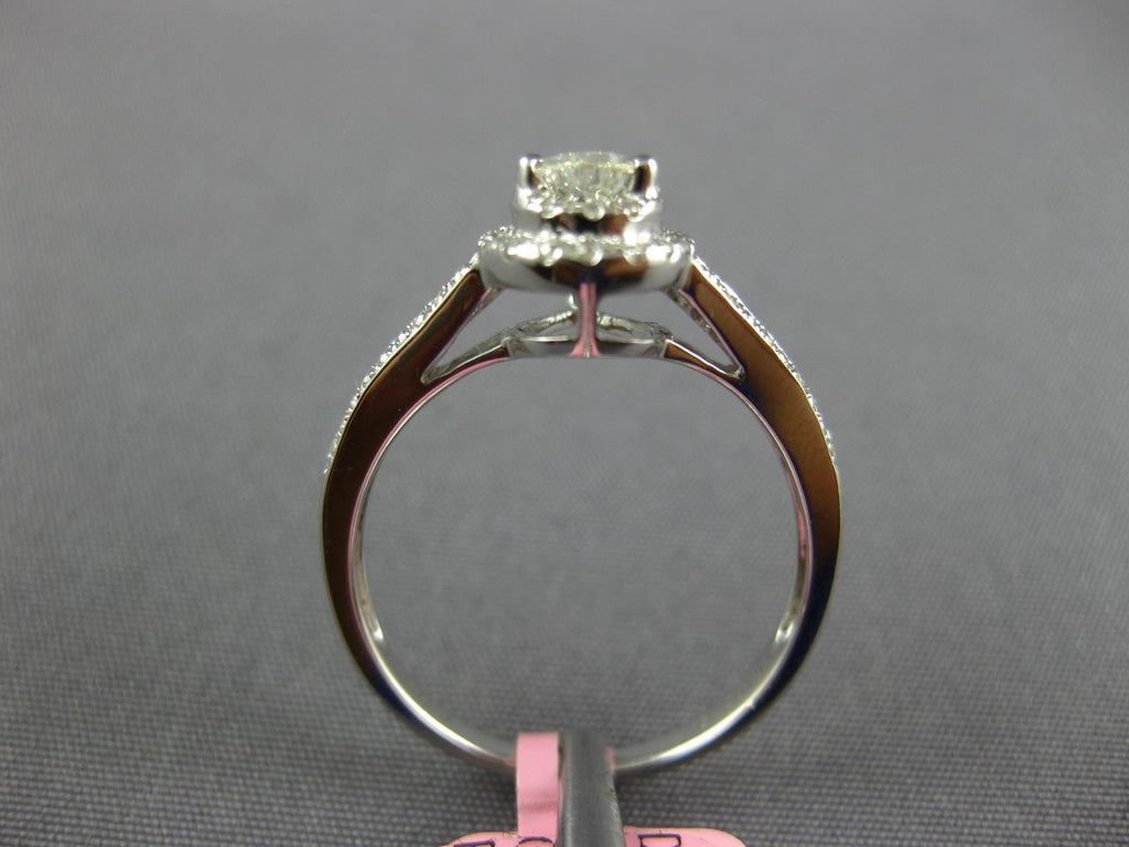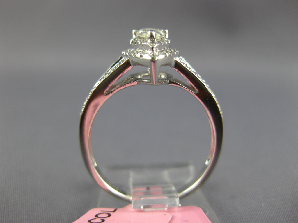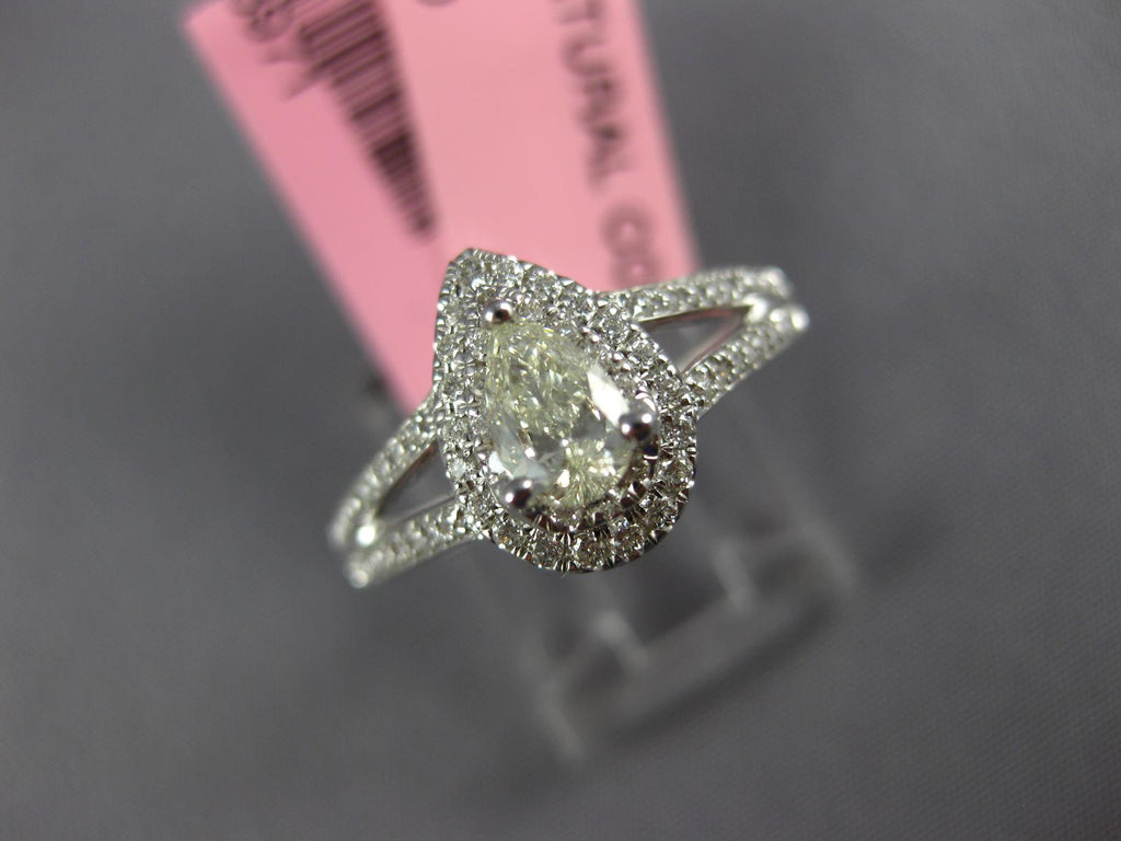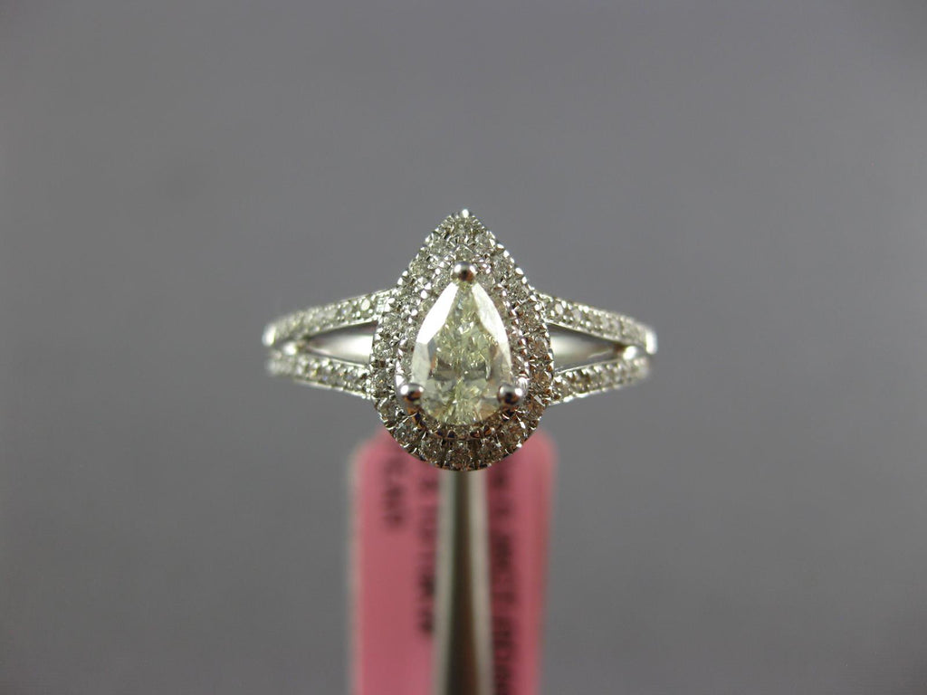 18KT WHITE GOLD ENGAGEMENT RING. 3D CLASSIC HALO DESIGN. WHITE DIAMONDS ARE F/G COLOR, VSSI CLARITY .26 CARATS. CENTER PEAR SHAPE CANARY DIAMOND IS .30 CARATS. MEASURES 10.8mm WIDE. RING SIZE 6.5. CAN BE SIZED BY OUR MASTER JEWELER UPON REQUEST. WRITTEN APPRAISAL AVAILABLE. COMES IN A PRESENTABLE GIFT BOX.