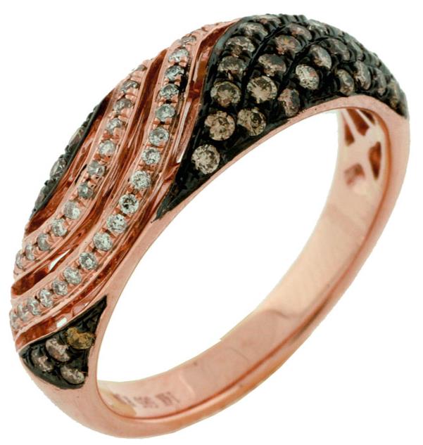 14KT ROSE GOLD ANNIVERSARY RING. 3D MULTI ROW PAVE DESIGN. WHITE DIAMONDS ARE F/G COLOR, VSSI CLARITY .11 CARATS. CHOCOLATE FANCY DIAMONDS ARE .45 CARATS. RING SIZE 7. CAN BE SIZED BY OUR MASTER JEWELER UPON REQUEST. WRITTEN APPRAISAL AVAILABLE. COMES IN A PRESENTABLE GIFT BOX.
