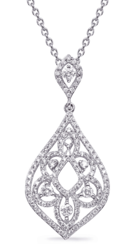 14KT WHITE GOLD FLOATING PENDANT. 3D CLASSIC FLOWER OPEN FILIGREE TEAR DROP DESIGN. DIAMONDS ARE F/G COLOR, VSSI CLARITY .57 CARATS. MEASURES 15mm WIDE. COMES ON A 14KT GOLD DIAMOND CUT 16" INCH CHAIN. WRITTEN APPRAISAL AVAILABLE. COMES IN A PRESENTABLE GIFT BOX.