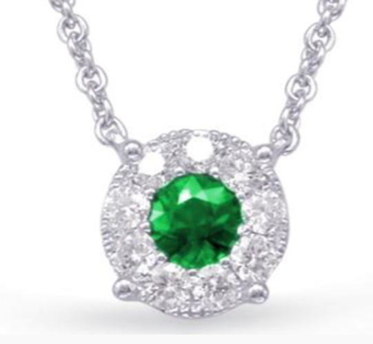 14KT WHITE GOLD LOVE NECKLACE. 3D HALO BY THE YARD DESIGN. ROUND DIAMONDS ARE F/G COLOR, VSSI CLARITY .24 CARATS. AAA ROUND EMERALD IS .33 CARATS. MEASURES 7mm WIDE. 18" INCHES LONG. WRITTEN APPRAISAL AVAILABLE. COMES IN A PRESENTABLE GIFT BOX.