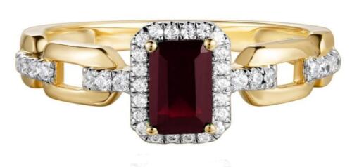 14KT YELLOW GOLD ENGAGEMENT RING. 3D SQUARE HALO LINK DESIGN. ROUND DIAMONDS ARE F/G COLOR, VSSI CLARITY .18 CARATS. AAA EMERALD CUT RUBY IS .40 CARATS. RING SIZE 7. CAN BE SIZED BY OUR MASTER JEWELER UPON REQUEST. WRITTEN APPRAISAL AVAILABLE. COMES IN A PRESENTABLE GIFT BOX.