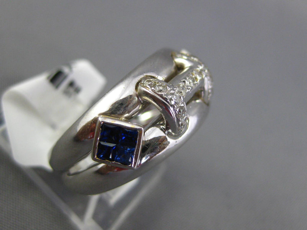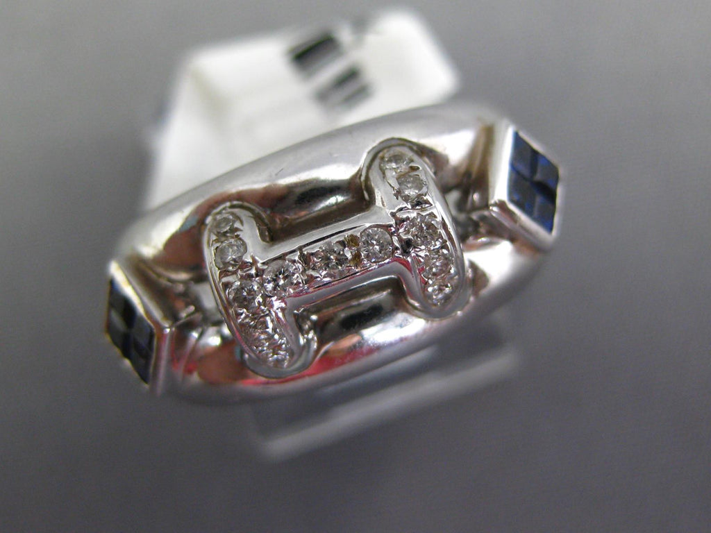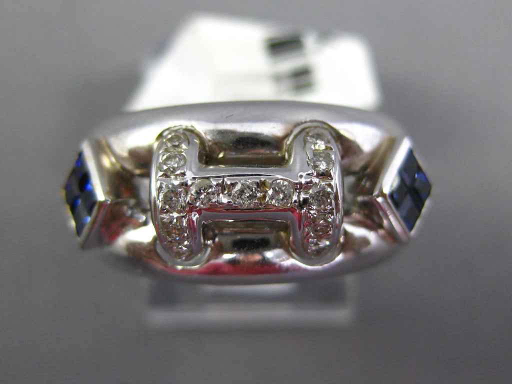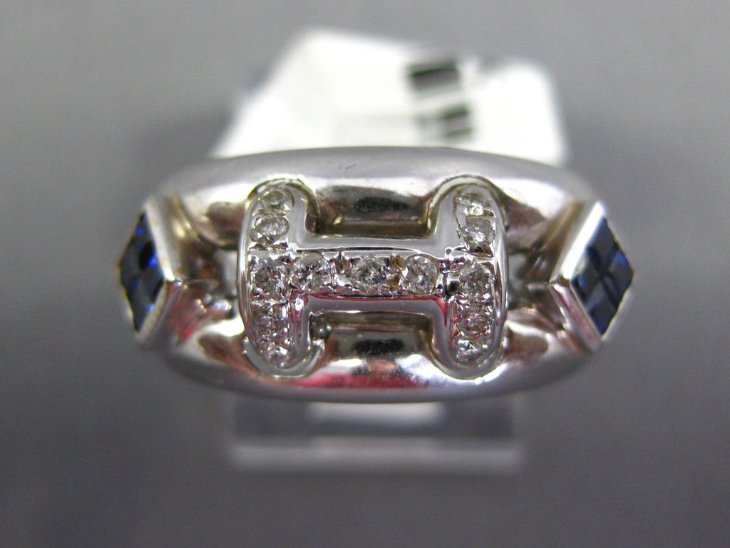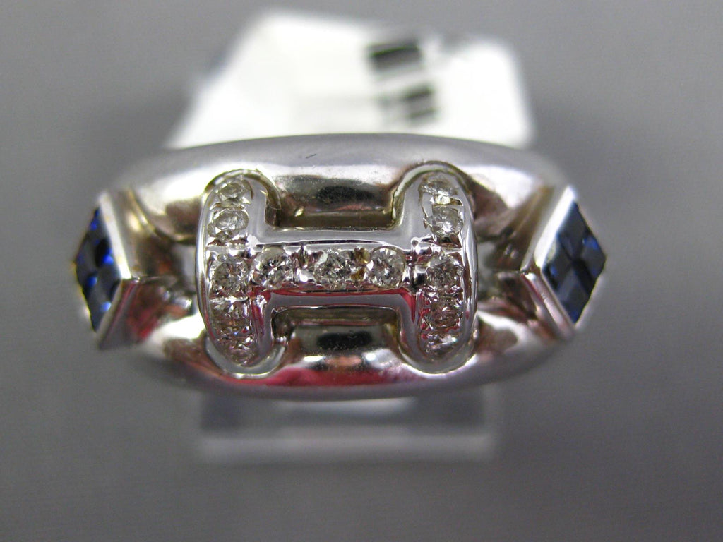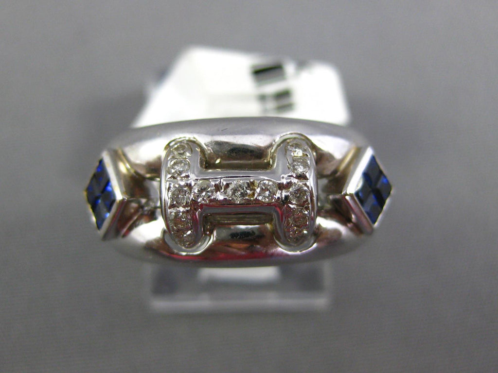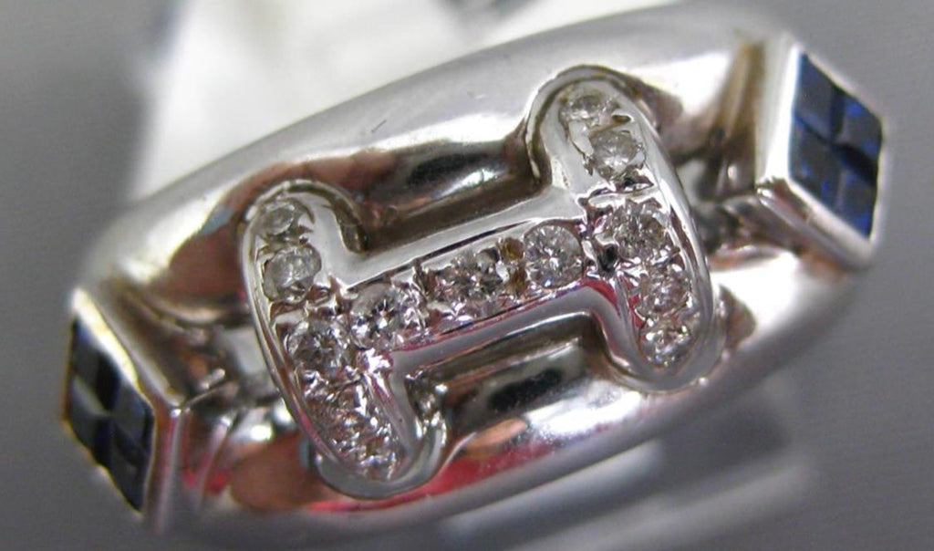18KT WHITE GOLD FUN RING. 3D H INITIAL DESIGN. ROUND DIAMONDS ARE F/G COLOR, VSSI CLARITY .16 CARATS. AAA PRINCESS CUT SAPPHIRES ARE .42 CARATS. MEASURES 9MM WIDE. RING SIZE 6.75. CAN BE SIZED BY OUR MASTER JEWELER UPON REQUEST. WRITTEN APPRAISAL AVAILABLE. COMES IN A PRESENTABLE GIFT BOX.