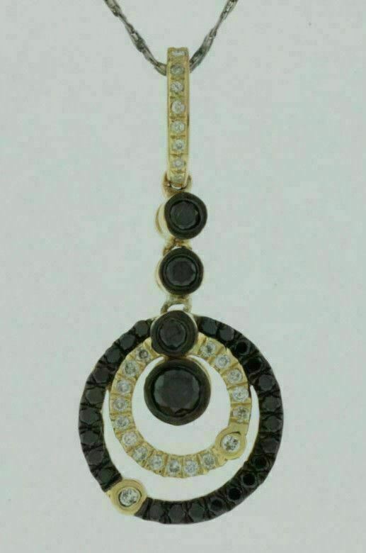 14KT YELLOW GOLD HANGING PENDANT. 3D CIRCLE OF LIFE JOURNEY DESIGN. WHITE DIAMONDS ARE F/G COLOR, VSSI CLARITY .10 CARATS. BLACK DIAMONDS ARE .48 CARATS. COMES ON A 14KT GOLD DIAMOND CUT 16" INCH CHAIN. WRITTEN APPRAISAL AVAILABLE. COMES IN A PRESENTABLE GIFT BOX.