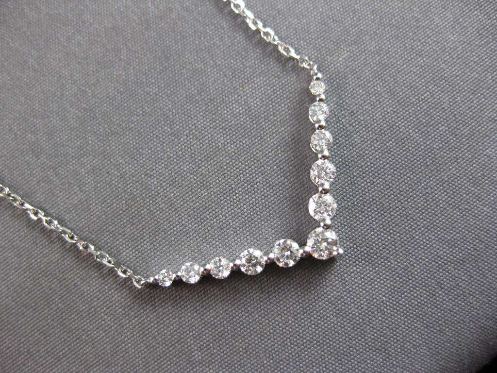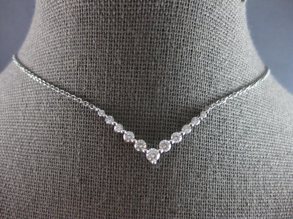 14KT WHITE GOLD LOVE NECKLACE. 3D CLASSIC V SHAPE SHARED PRONG DESIGN. ROUND DIAMONDS ARE F/G COLOR, VVS-VS CLARITY .59 CARATS. MEASURES 4.5mm X 28mm. CAN BE WORN 16-18" INCHES LONG. WRITTEN APPRAISAL AVAILABLE. COMES IN A PRESENTABLE GIFT BOX.