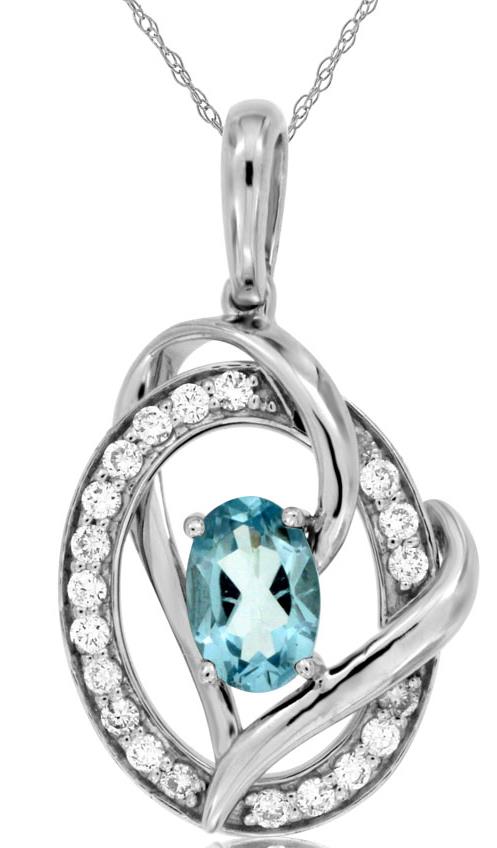14KT WHITE GOLD FLOATING PENDANT. 3D HEART SHAPE LOVE KNOT DESIGN. ROUND DIAMONDS ARE F/G COLOR, VSSI CLARITY .17 CARATS. AAA EXTRA FACETED OVAL AQUAMARINE IS .42 CARATS. COMES ON A 14KT GOLD DIAMOND CUT 18" INCH CHAIN. WRITTEN APPRAISAL AVAILABLE. COMES IN A PRESENTABLE GIFT BOX.