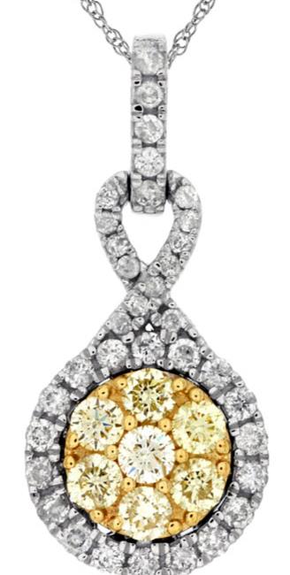 14KT WHITE AND YELLOW GOLD FLOATING PENDANT. 3D CLU STER INFINITY DESIGN. ROUND WHITE DIAMONDS ARE F/G COLOR, VSSI CLARITY .30 CARATS. FANCY YELLOW DIAMONDS ARE .29 CARATS. COMES ON A 14KT GOLD DIAMOND CUT 16" INCH CHAIN. WRITTEN APPRAISAL AVAILABLE. COMES IN A PRESENTABLE GIFT BOX.