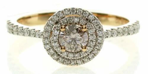 18KT WHITE AND ROSE GOLD ENGAGEMENT RING. 3D DOUBLE HALO DESIGN. WHITE DIAMONDS ARE F/G COLOR, VSSI CLARITY .29 CARATS. PINK DIAMONDS ARE .30 CARATS. RING SIZE 7. CAN BE SIZED BY OUR MASTER JEWELER UPON REQUEST. WRITTEN APPRAISAL AVAILABLE. COMES IN A PRESENTABLE GIFT BOX.