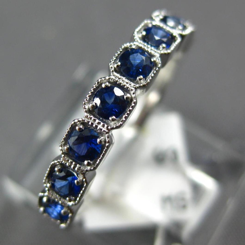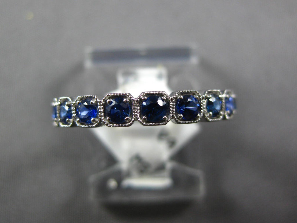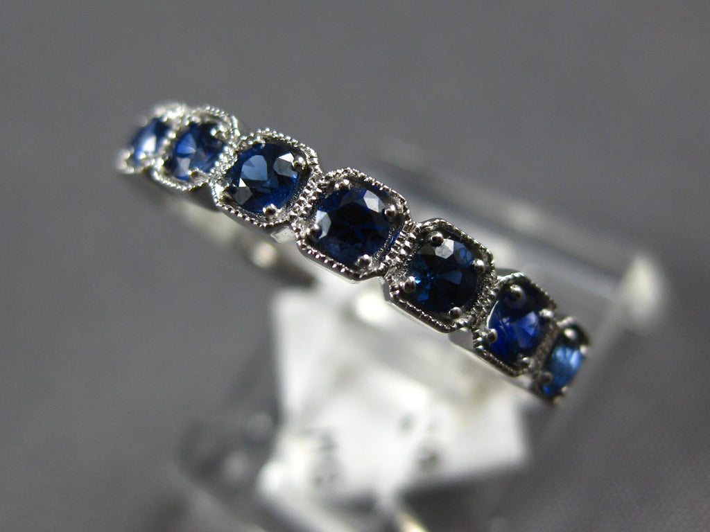 14KT WHITE GOLD ANNIVERSARY RING. 3D SQUARE FILIGREE SEMI ETERNITY DESIGN. AAA ROUND SAPPHIRES ARE .60 CARATS. MEASURES 3mm WIDE. RING SIZE 6.5. CAN BE SIZED BY OUR MASTER JEWELER UPON REQUEST. WRITTEN APPRAISAL AVAILABLE. COMES IN A PRESENTABLE GIFT BOX.