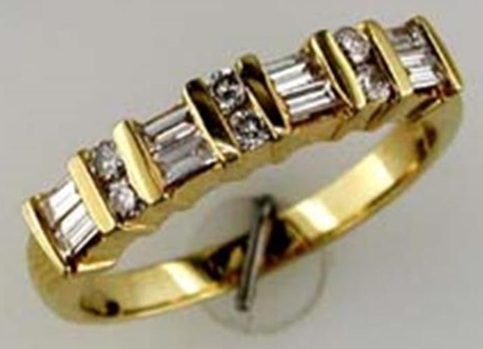 14KT YELLOW GOLD ANNIVERSARY RING. 3D CLASSIC TWO ROW CHANNEL DESIGN. DIAMONDS ARE F/G COLOR, VSSI CLARITY. ROUND DIAMONDS ARE .16 CARATS. BAGUETTE DIAMONDS ARE .44 CARATS. RING SIZE 7. CAN BE SIZED BY OUR MASTER JEWELER UPON REQUEST. WRITTEN APPRAISAL AVAILABLE. COMES IN A PRESENTABLE GIFT BOX.