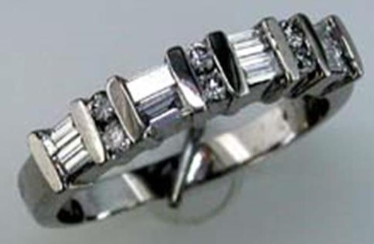 14KT WHITE GOLD ANNIVERSARY RING. 3D CLASSIC TWO ROW CHANNEL DESIGN. DIAMONDS ARE F/G COLOR, VSSI CLARITY. ROUND DIAMONDS ARE .16 CARATS. BAGUETTE DIAMONDS ARE .44 CARATS. RING SIZE 7. CAN BE SIZED BY OUR MASTER JEWELER UPON REQUEST. WRITTEN APPRAISAL AVAILABLE. COMES IN A PRESENTABLE GIFT BOX.