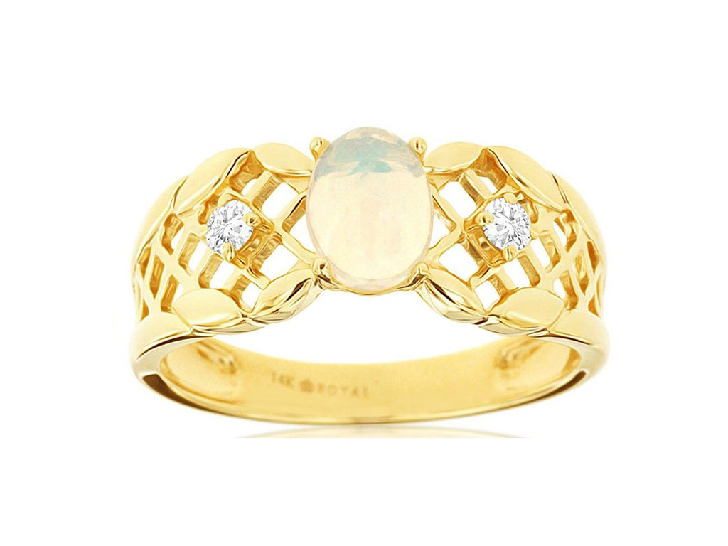 14KT YELLOW GOLD FUN RING. 3D THREE STONE FILIGREE DESIGN. ROUND DIAMONDS ARE F/G COLOR, VSSI CLARITY .10 CARATS. AAA OVAL OPAL IS .50 CARATS. RING SIZE 7. CAN BE SIZED BY OUR MASTER JEWELER UPON REQUEST. WRITTEN APPRAISAL AVAILABLE. COMES IN A PRESENTABLE GIFT BOX.