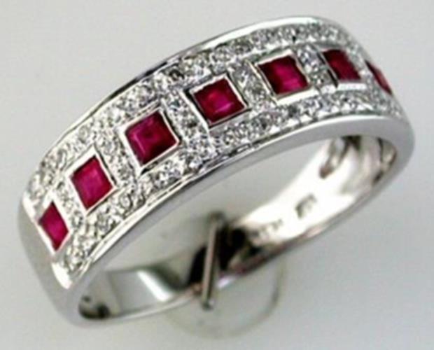 14KT WHITE GOLD ANNIVERSARY RING. 3D ETOILE DESIGN. ROUND DIAMONDS ARE F/G COLOR, VSSI CLARITY .17 CARATS. AAA PRINCESS CUT RUBIES ARE .43 CARATS. RING SIZE 7. CAN BE SIZED BY OUR MASTER JEWELER UPON REQUEST. WRITTEN APPRAISAL AVAILABLE. COMES IN A PRESENTABLE GIFT BOX.