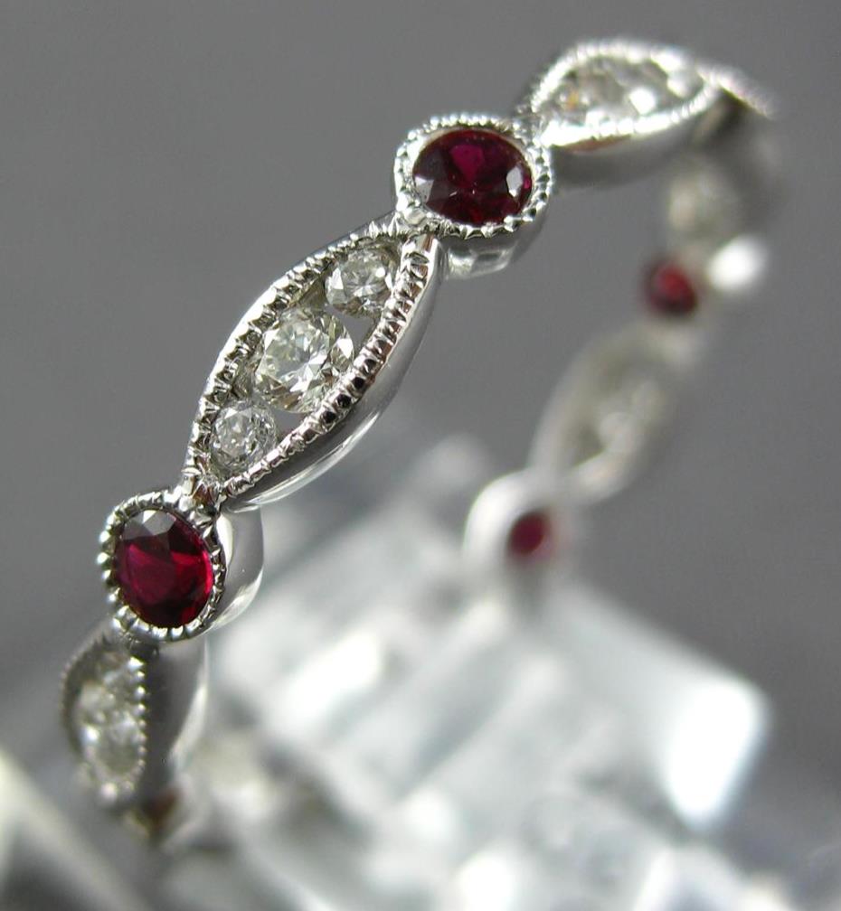 18KT WHITE GOLD FUN RING. 3D FILIGREE MILGRAIN ETERNITY MARQUISE SHAPE DESIGN. ROUND DIAMONDS ARE F/G COLOR, VSSI CLARITY .30 CARATS. AAA ROUND RUBIES ARE .30 CARATS. MEASURES 3mm WIDE. RING SIZE 6.5. CAN BE SIZED BY OUR MASTER JEWELER UPON REQUEST. WRITTEN APPRAISAL AVAILABLE. COMES IN A PRESENTABLE GIFT BOX.
