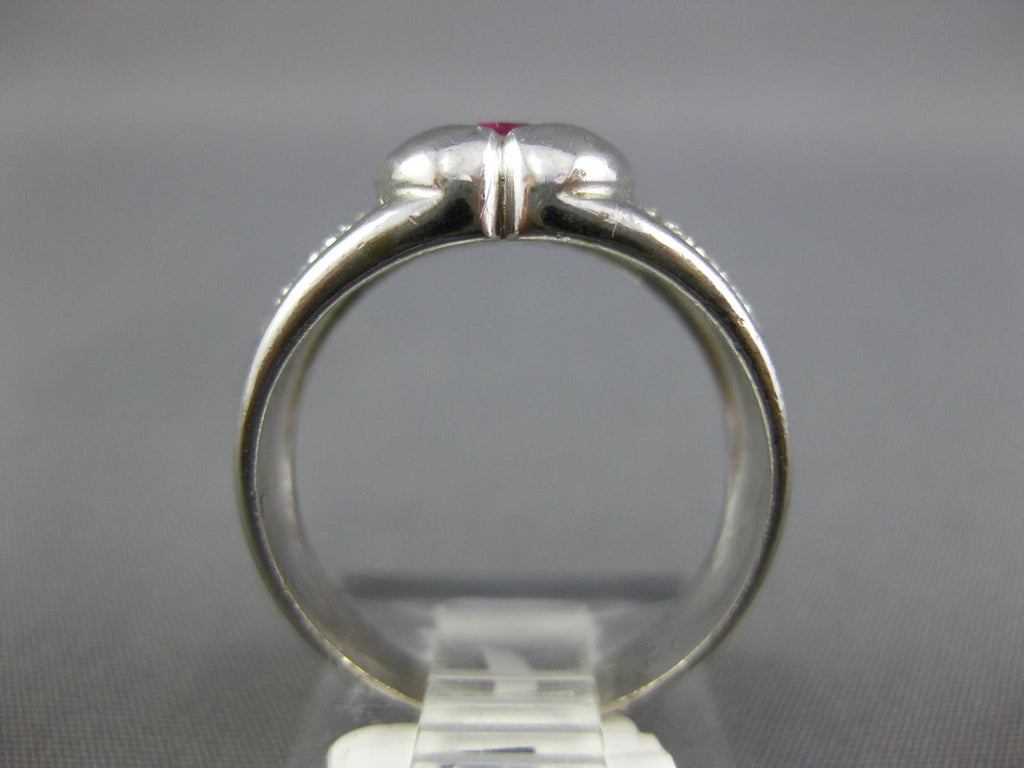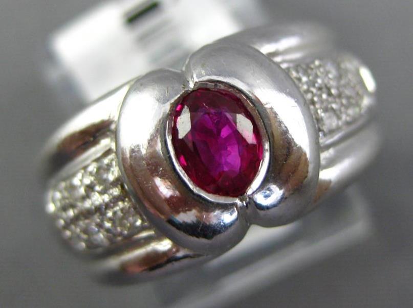 18KT WHITE GOLD FRIENDSHIP LOVE RING. 3D BEZEL DESIGN. ROUND DIAMONDS ARE F/G COLOR, VSSI CLARITY .15 CARATS. AAA OVAL RUBY IS .45 CARATS. MEASURES 9mm WIDE. RING SIZE 7.25. CAN BE SIZED BY OUR MASTER JEWELER UPON REQUEST. WRITTEN APPRAISAL AVAILABLE. COMES IN A PRESENTABLE GIFT BOX.
