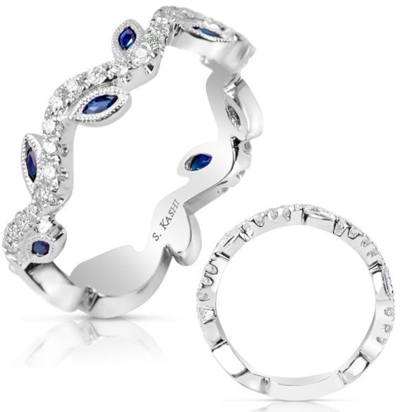 14KT WHITE GOLD ANNIVERSARY RING. 3D MULTI LEAF THREE FOURTHS ETERNITY DESIGN. ROUND DIAMONDS ARE F/G COLOR, VSSI CLARITY .30 CARATS. AAA MARQUISE SAPPHIRES ARE .30 CARATS. MEASURES 5mm WIDE. RING SIZE 6.25. CAN BE SIZED BY OUR MASTER JEWELER UPON REQUEST. WRITTEN APPRAISAL AVAILABLE. COMES IN A PRESENTABLE GIFT BOX.