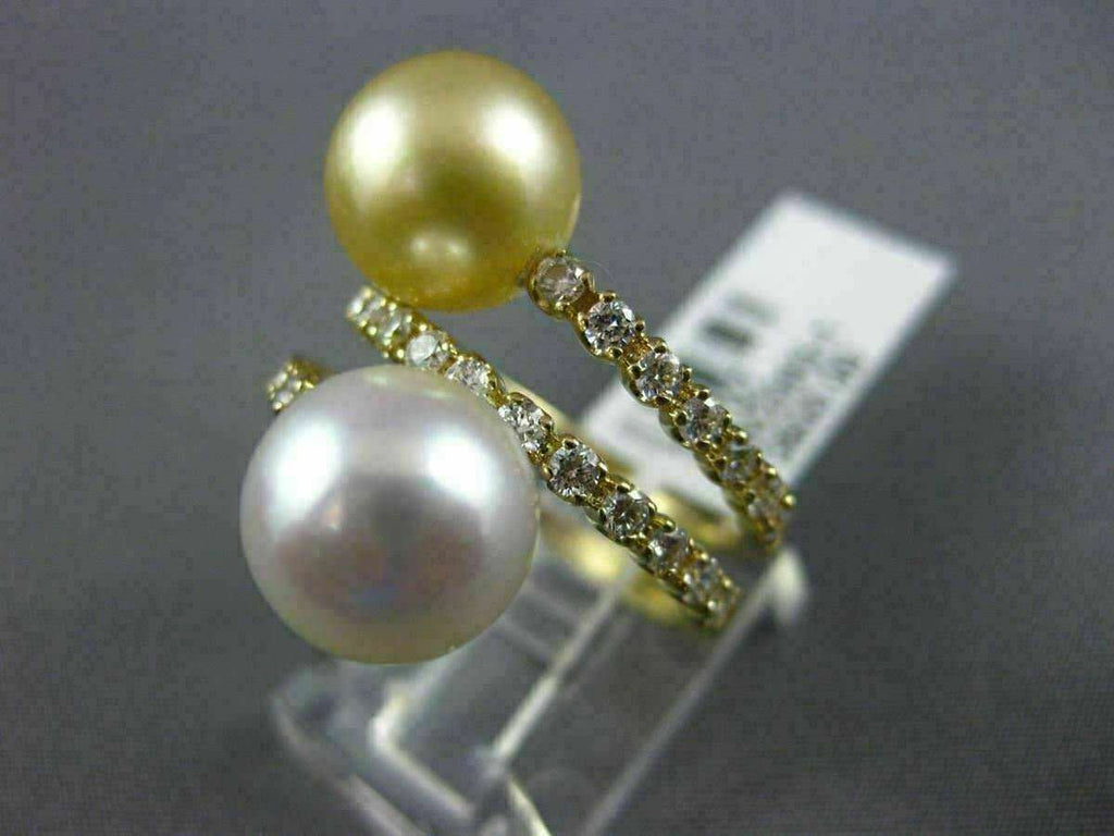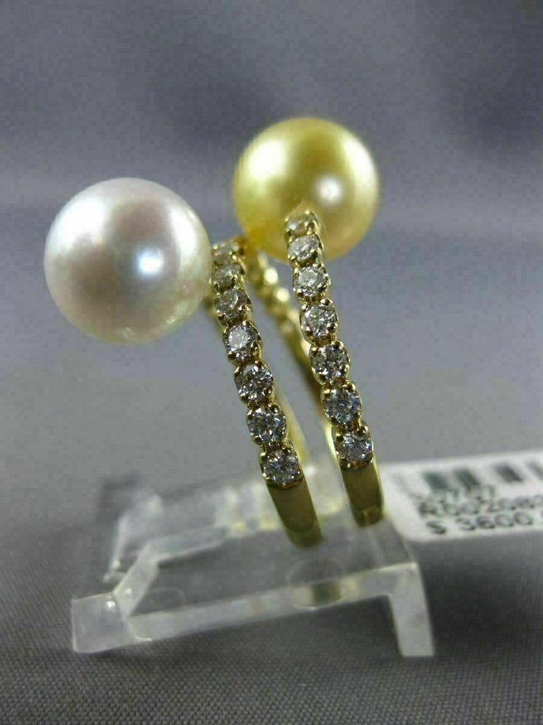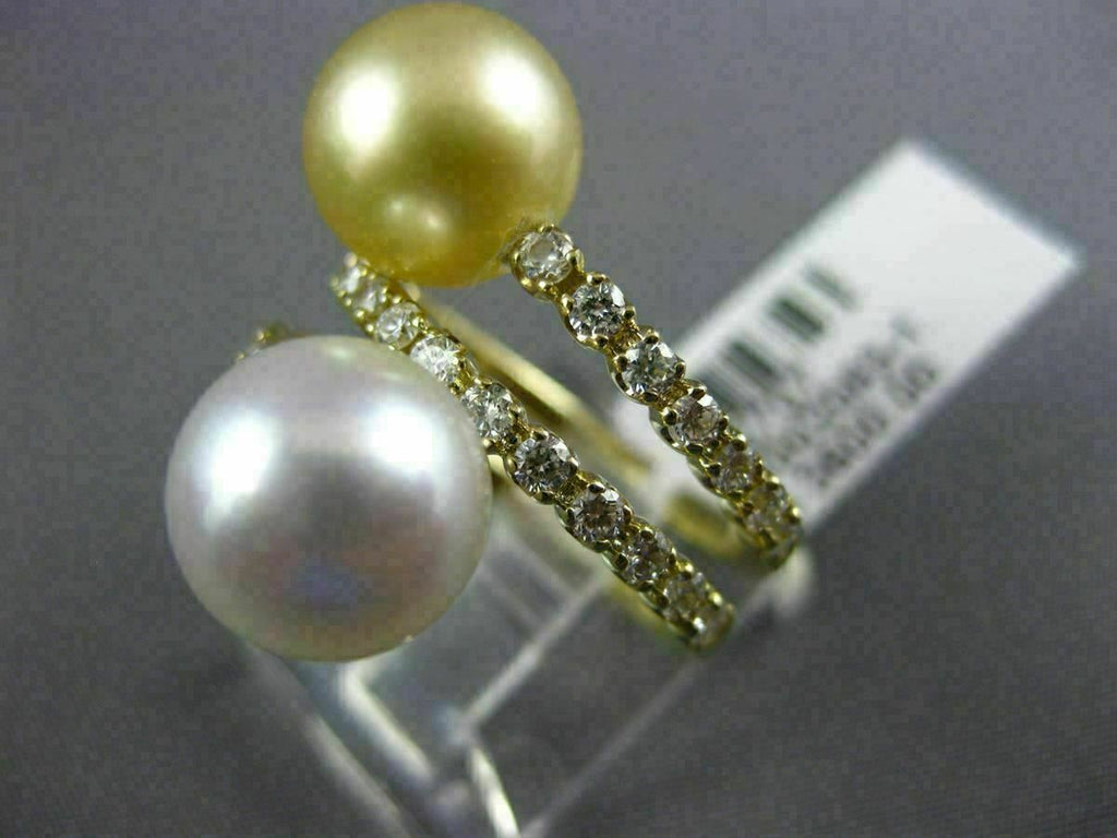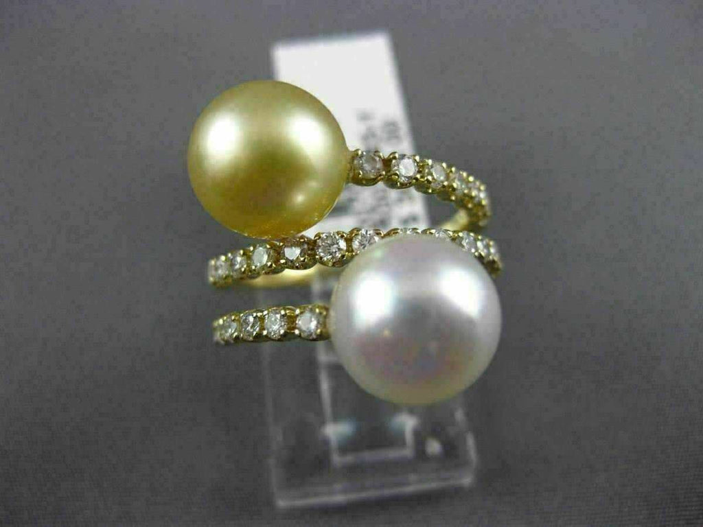 18KT YELLOW GOLD RING. 3D CRISS CROSS DESIGN. DIAMONDS ARE F/G COLOR, VSSI CLARITY .60 CARATS. FEATURES AAA SOUTH SEA PEARL AND AAA GOLDEN SOUTH SEA PEARL. MEASURES 20MM WIDE. RING SIZE 7. CAN BE SIZED BY OUR MASTER JEWELER UPON REQUEST. WRITTEN APPRAISAL AVAILABLE. COMES IN A PRESENTABLE GIFT BOX