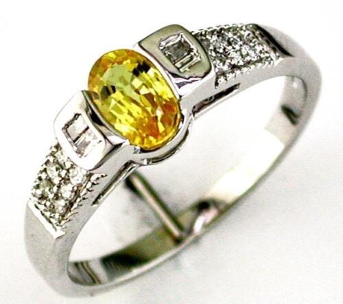 14KT WHITE GOLD FRIENDSHIP LOVE RING. 3D DESIGN. ROUND AND BAGUETTE DIAMONDS ARE F/G COLOR, VSSI CLARITY .15 CARATS. AAA EXTRA FACETED OVAL YELLOW SAPPHIRE IS .45 CARATS. RING SIZE 7. CAN BE SIZED BY OUR MASTER JEWELER UPON REQUEST. WRITTEN APPRAISAL AVAILABLE. COMES IN A PRESENTABLE GIFT BOX.