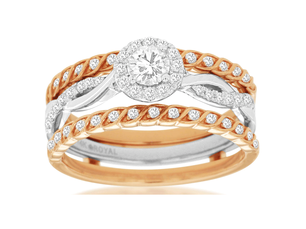 14KT WHITE AND ROSE GOLD LOVE INSERT ENGAGEMENT RING SET. 3D SOLITAIRE HALO INFINITY DESIGN. ROUND DIAMONDS ARE F/G COLOR, VSSI CLARITY .61 CARATS. RING SIZE 7. CAN BE SIZED BY OUR MASTER JEWELER UPON REQUEST. WRITTEN APPRAISAL AVAILABLE. COMES IN A PRESENTABLE GIFT BOX.
