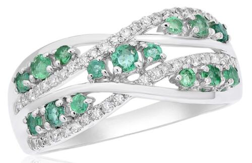 14KT WHITE GOLD LOVE RING. 3D MULTI ROW CRISS CROSS INFINITY DESIGN. DIAMONDS ARE F/G COLOR, VSSI CLARITY .17 CARATS. AAA EMERALDS ARE .44 CARATS. RING SIZE 7. CAN BE SIZED BY OUR MASTER JEWELER UPON REQUEST. WRITTEN APPRAISAL AVAILABLE. COMES IN A PRESENTABLE GIFT BOX.