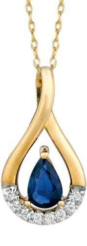 14KT YELLOW GOLD PENDANT. 3D INFINITY TEAR DROP DESIGN. ROUND DIAMONDS ARE F/G COLOR, VSSI CLARITY .06 CARATS. AAA PEAR SHAPE SAPPHIRE IS .55 CARATS. COMES ON A 14KT GOLD DIAMOND CUT 16" INCH CHAIN. WRITTEN APPRAISAL AVAILABLE. COMES IN A PRESENTABLE GIFT BOX.