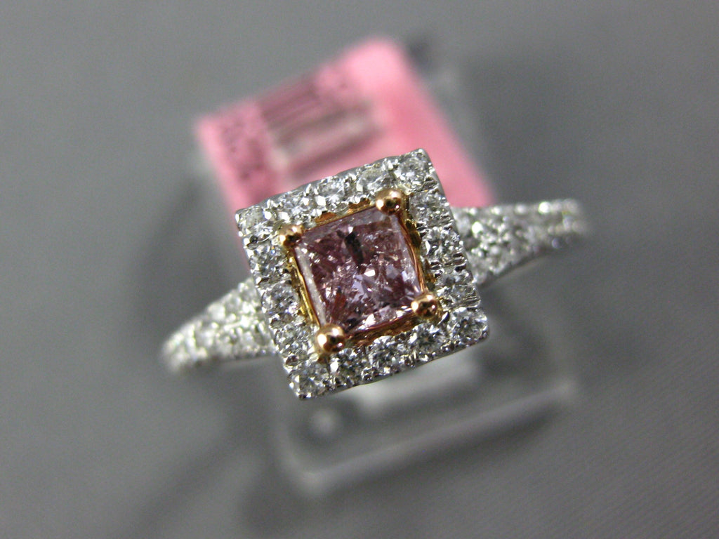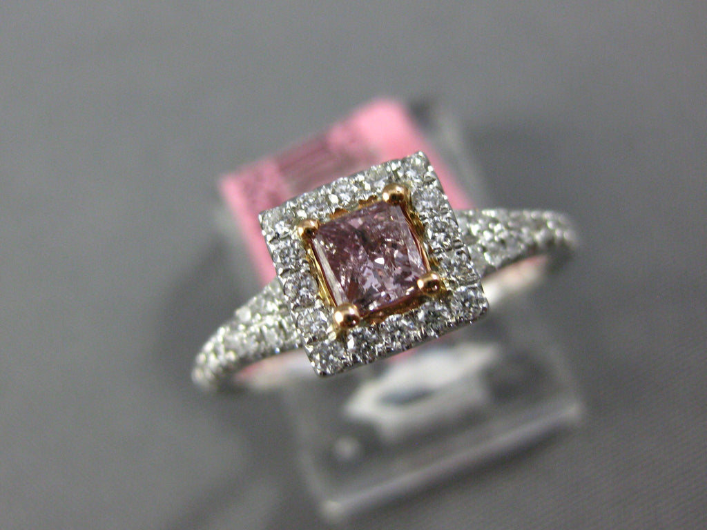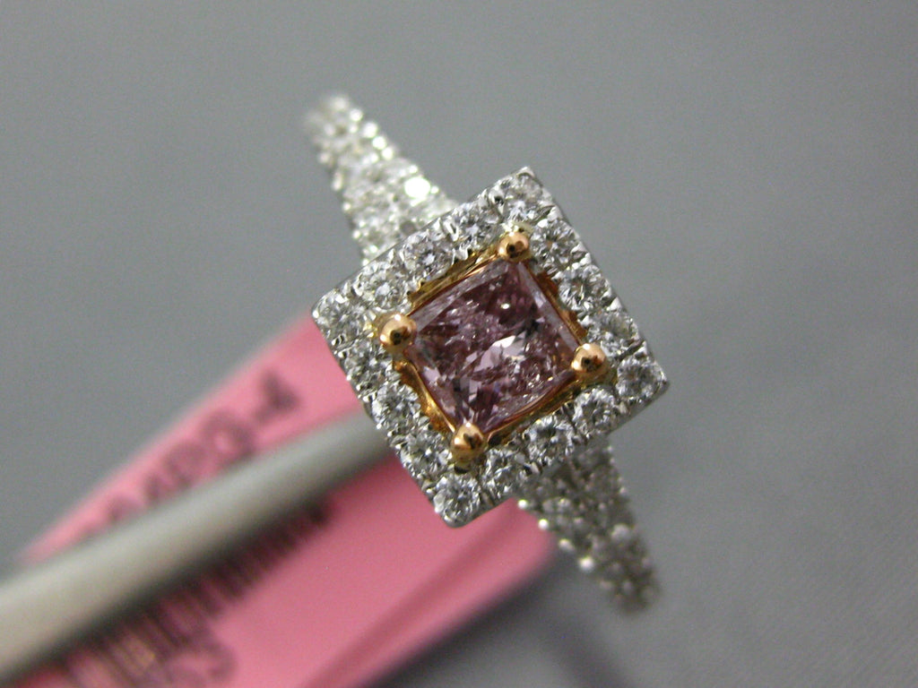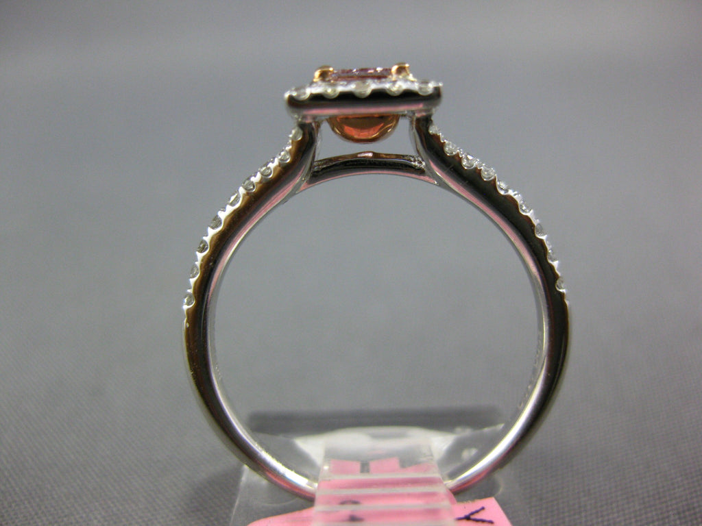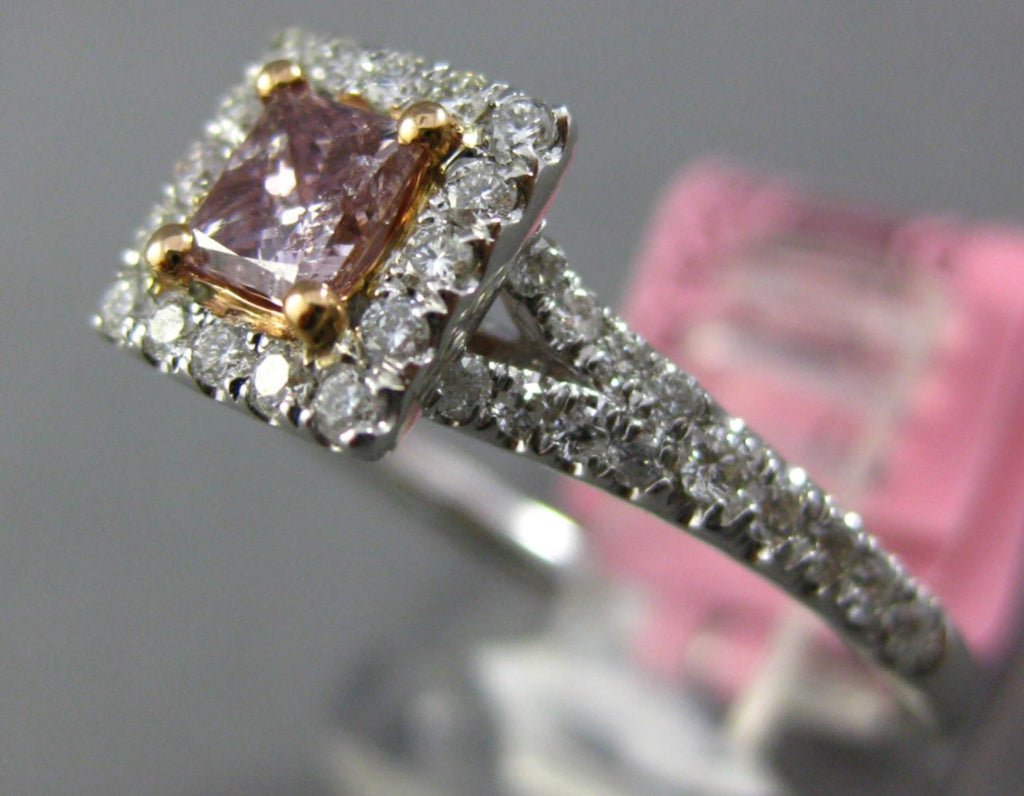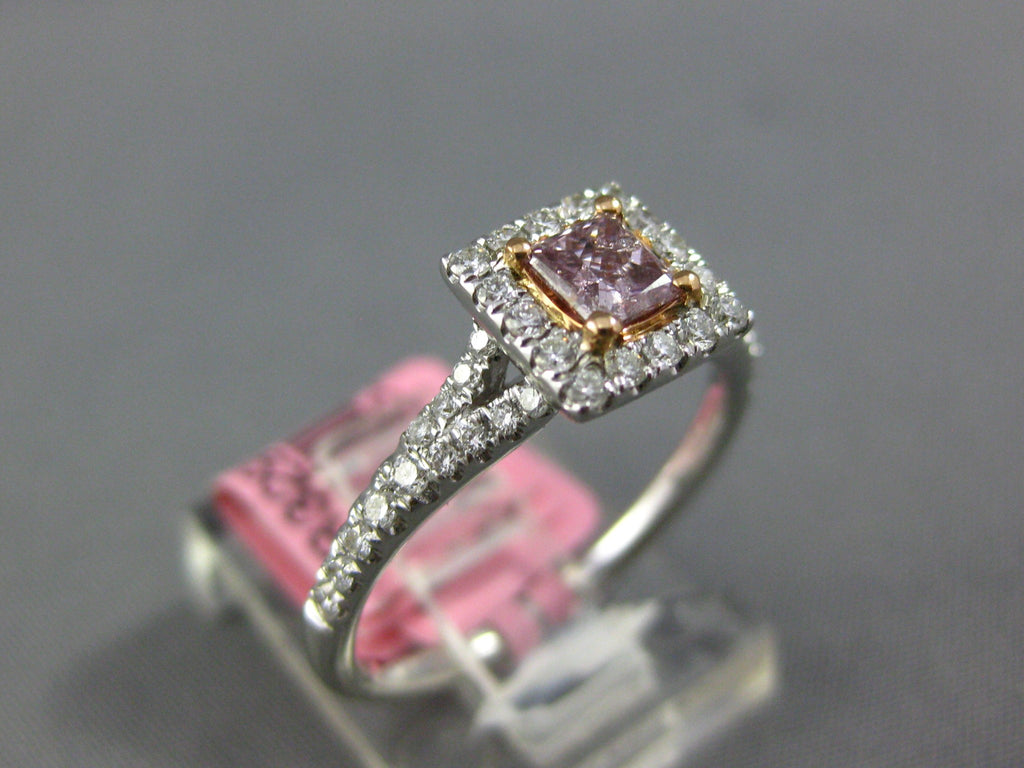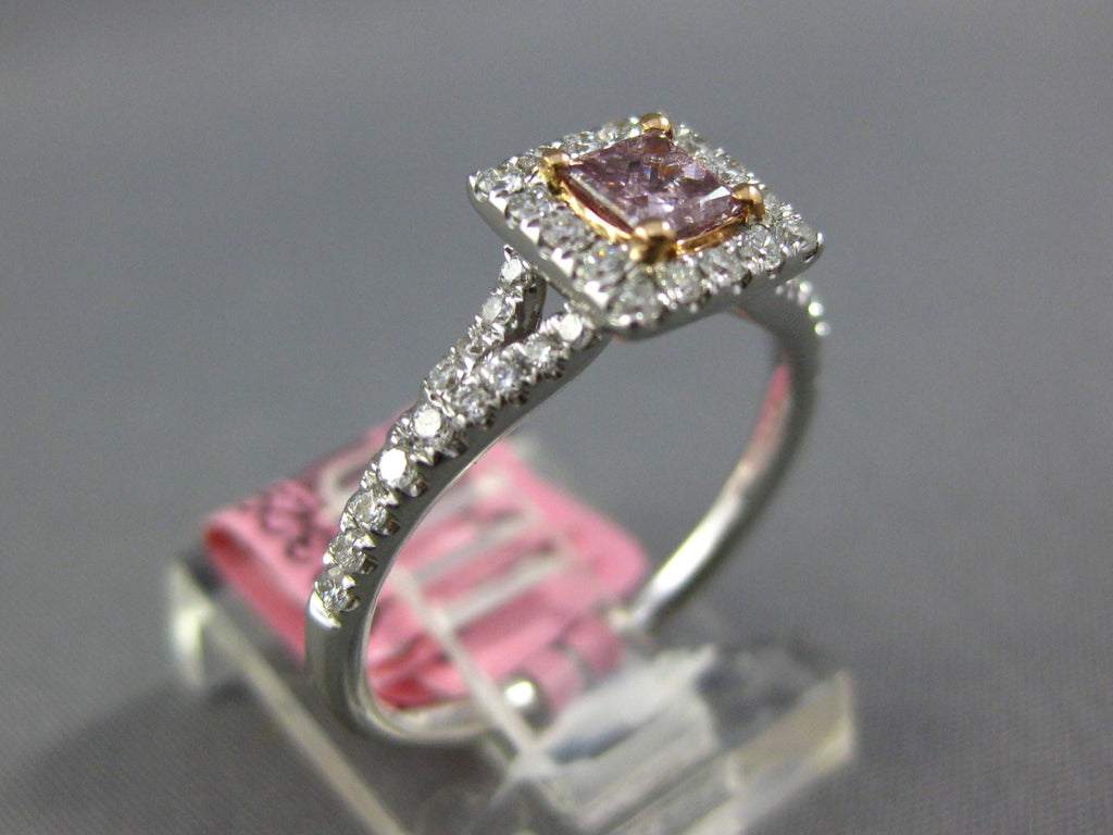 18KT WHITE AND ROSE GOLD ENGAGEMENT RING. 3D SQUARE CLASSIC HALO DESIGN. ROUND WHITE DIAMONDS ARE F/G COLOR, VSSI CLARITY .32 CARATS. CENTER PRINCESS CUT PINK DIAMOND IS .29 CARATS. MEASURES 7mm WIDE. RING SIZE 6.25. CAN BE SIZED BY OUR MASTER JEWELER UPON REQUEST. WRITTEN APPRAISAL AVAILABLE. COMES IN A PRESENTABLE GIFT BOX.