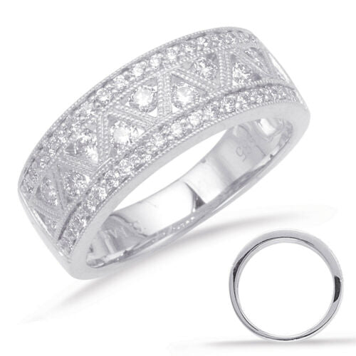 14KT WHITE GOLD ANNIVERSARY RING. 3D OPEN FILIGREE TRIANGULAR DESIGN. ROUND DIAMONDS ARE F/G COLOR, VSSI CLARITY .62 CARATS. RING SIZE 6.5. CAN BE SIZED BY OUR MASTER JEWELER UPON REQUEST. WRITTEN APPRAISAL AVAILABLE. COMES IN A PRESENTABLE GIFT BOX.