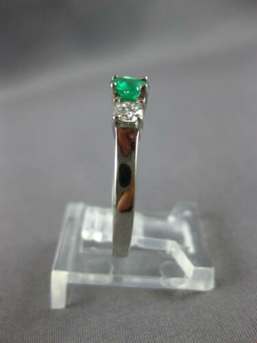 14KT WHITE GOLD ENGAGEMENT RING. 3D THREE STONE CLASSIC DESIGN. ROUND DIAMONDS ARE F/G COLOR, VVS-VS CLARITY .30 CARATS. AAA ROUND EMERALD IS .32 CARATS. MEASURES 4.5mm WIDE. RING SIZE 6.75. CAN BE SIZED BY OUR MASTER JEWELER UPON REQUEST. WRITTEN APPRAISAL AVAILABLE. COMES IN A PRESENTABLE GIFT BOX.