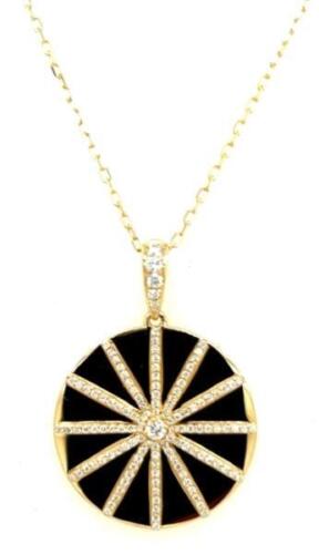 18KT WHITE AND YELLOW GOLD FLOATING PENDANT. 3D CIRCULAR STARBURST DESIGN. DIAMONDS ARE F/G COLOR, VSSI CLARITY .62 CARATS. FEATURES AAA ONYX. COMES ON A 14KT GOLD DIAMOND CUT 16" INCH CHAIN. WRITTEN APPRAISAL AVAILABLE. COMES IN A PRESENTABLE GIFT BOX.