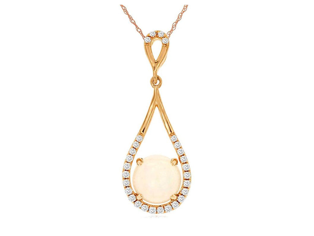 14KT ROSE GOLD FLOATING PENDANT. 3D CLASSIC TEAR DROP DESIGN. ROUND DIAMONDS ARE F/G COLOR, VSSI CLARITY .12 CARATS. AAA ROUND OPAL IS .50 CARATS. COMES ON A 14KT GOLD DIAMOND CUT 18" INCH CHAIN. WRITTEN APPRAISAL AVAILABLE. COMES IN A PRESENTABLE GIFT BOX.