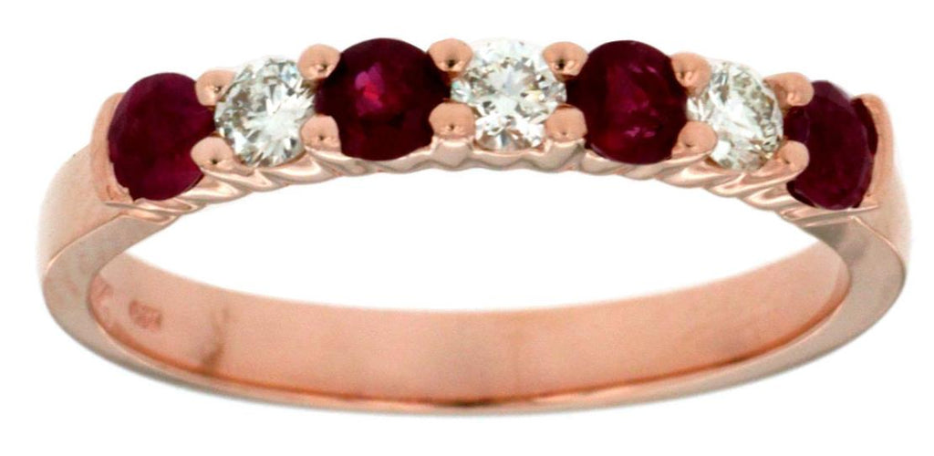 14KT ROSE GOLD ANNIVERSARY RING. 3D SEVEN STONE SHARED PRONG DESIGN. DIAMONDS ARE F/G COLOR, VSSI CLARITY .22 CARATS. AAA ROUND RUBY IS .40 CARATS. RING SIZE 7. CAN BE SIZED BY OUR MASTER JEWELER UPON REQUEST. WRITTEN APPRAISAL AVAILABLE. COMES IN A PRESENTABLE GIFT BOX.