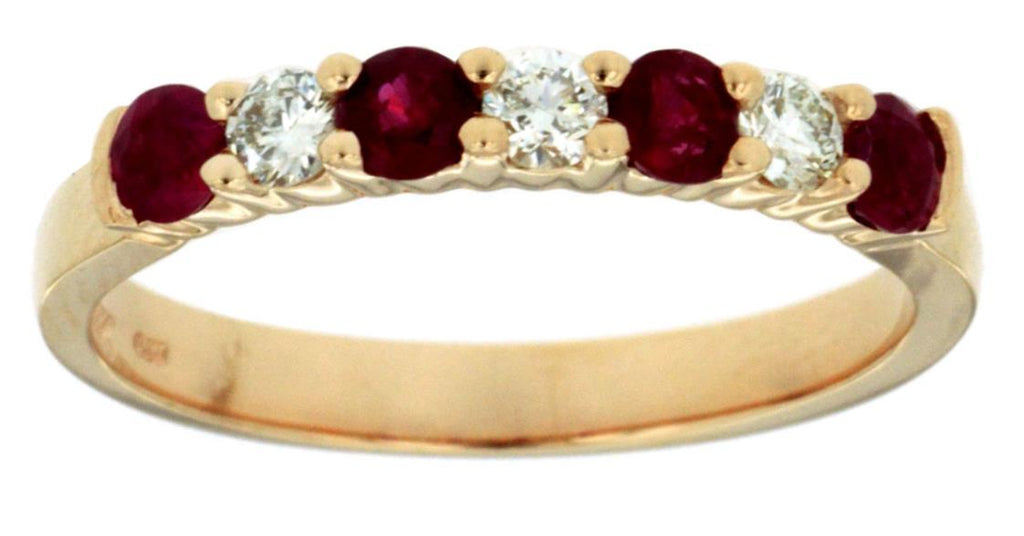 14KT YELLOW GOLD ANNIVERSARY RING. 3D SEVEN STONE SHARE PRONG DESIGN. ROUND DIAMONDS ARE F/G COLOR, VSSI CLARITY .22 CARATS. AAA ROUND RUBIES ARE .40 CARATS. RING SIZE 7. CAN BE SIZED BY OUR MASTER JEWELER UPON REQUEST. WRITTEN APPRAISAL AVAILABLE. COMES IN A PRESENTABLE GIFT BOX.