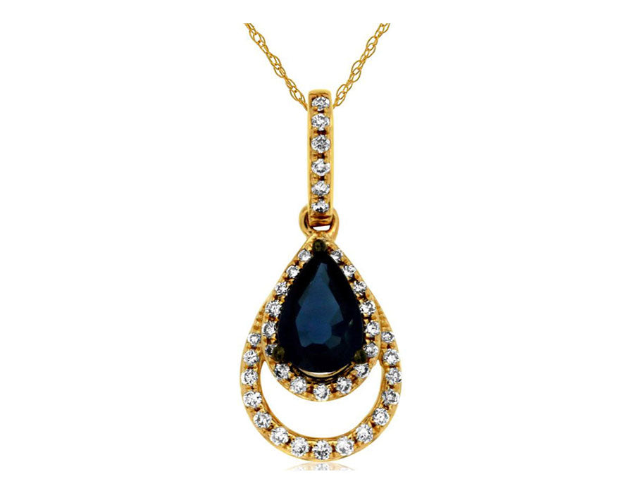 14KT YELLOW GOLD FLOATING PENDANT. 3D DOUBLE HALO TEAR DROP DESIGN. ROUND DIAMONDS ARE F/G COLOR, VSSI CLARITY .11 CARATS. AAA EXTRA FACETED PEAR SHAPE SAPPHIRE IS .52 CARATS. COMES ON A 14KT GOLD DIAMOND CUT 18" INCH CHAIN. WRITTEN APPRAISAL AVAILABLE. COMES IN A PRESENTABLE GIFT BOX.