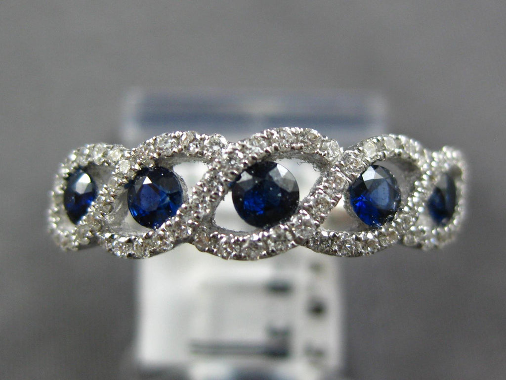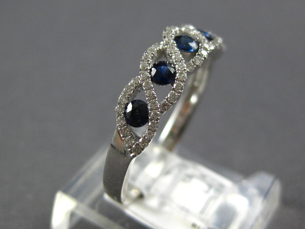 18KT WHITE GOLD ANNIVERSARY RING. 3D INFINITY ETOILE DESIGN. ROUND DIAMONDS ARE F/G COLOR, VSSI CLARITY .24 CARATS. AAA ROUND SAPPHIRES ARE .39 CARATS. MEASURES 5mm WIDE. RING SIZE 6.5. CAN BE SIZED BY OUR MASTER JEWELER UPON REQUEST. WRITTEN APPRAISAL AVAILABLE. COMES IN A PRESENTABLE GIFT BOX.