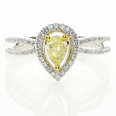18KT WHITE AND YELLOW GOLD ENGAGEMENT RING. 3D CLASSIC INFINITY DESIGN. ROUND WHITE DIAMONDS ARE F/G COLOR, VSSI CLARITY .29 CARATS. FANCY YELLOW PEAR SHAPE DIAMOND IS .34 CARATS. RING SIZE 7. CAN BE SIZED BY OUR MASTER JEWELER UPON REQUEST. WRITTEN APPRAISAL AVAILABLE. COMES IN A PRESENTABLE GIFT BOX.