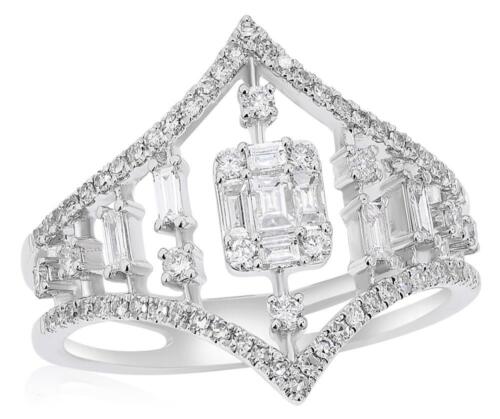14KT WHITE GOLD FUN RING. 3D DOUBLE V SQUARE DESIGN. DIAMONDS ARE F/G COLOR, VSSI CLARITY. ROUND DIAMONDS ARE .39 CARATS. BAGUETTE DIAMONDS ARE .25 CARATS. RING SIZE 7. CAN BE SIZED BY OUR MASTER JEWELER UPON REQUEST. WRITTEN APPRAISAL AVAILABLE. COMES IN A PRESENTABLE GIFT BOX.