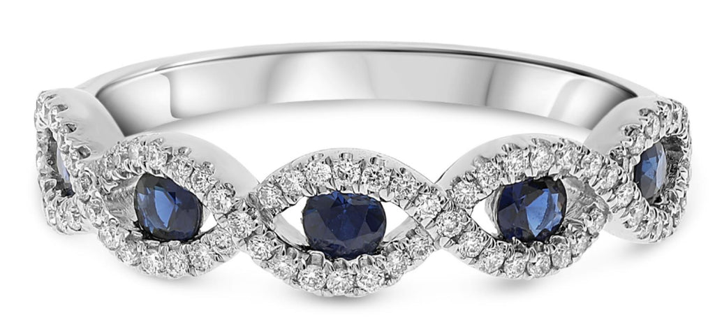 14KT WHITE GOLD LOVE ANNIVERSARY RING. 3D ETOILE INFINITY DESIGN. ROUND DIAMONDS ARE F/G COLOR, VSSI CLARITY .22 CARATS. AAA ROUND SAPPHIRES ARE .42 CARATS. MEASURES 4.53mm X 2.41mm. RING SIZE 6.5. CAN BE SIZED BY OUR MASTER JEWELER UPON REQUEST. WRITTEN APPRAISAL AVAILABLE. COMES IN A PRESENTABLE GIFT BOX.