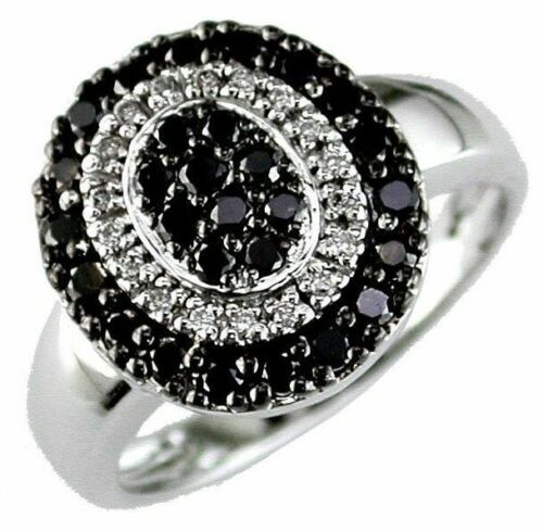 14KT WHITE GOLD FUN RING. 3D CLUSTER OVAL DOUBLE HALO DESIGN. WHITE DIAMONDS ARE F/G COLOR, VSSI CLARITY .07 CARATS. BLACK DIAMONDS ARE .57 CARATS. RING SIZE 7. CAN BE SIZED BY OUR MASTER JEWELER UPON REQUEST. WRITTEN APPRAISAL AVAILABLE. COMES IN A PRESENTABLE GIFT BOX.