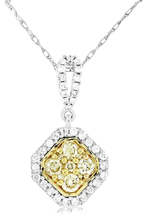 14KT WHITE AND YELLOW GOLD FLOATING PENDANT. 3D CLUSTER OCTAGON DESIGN. WHITE DIAMONDS ARE F/G COLOR, VSSI CLARITY .27 CARATS. FANCY YELLOW DIAMONDS .38 CARATS. COMES ON A 14KT GOLD DIAMOND CUT 18" INCH CHAIN. WRITTEN APPRAISAL AVAILABLE. COMES IN A PRESENTABLE GIFT BOX.
