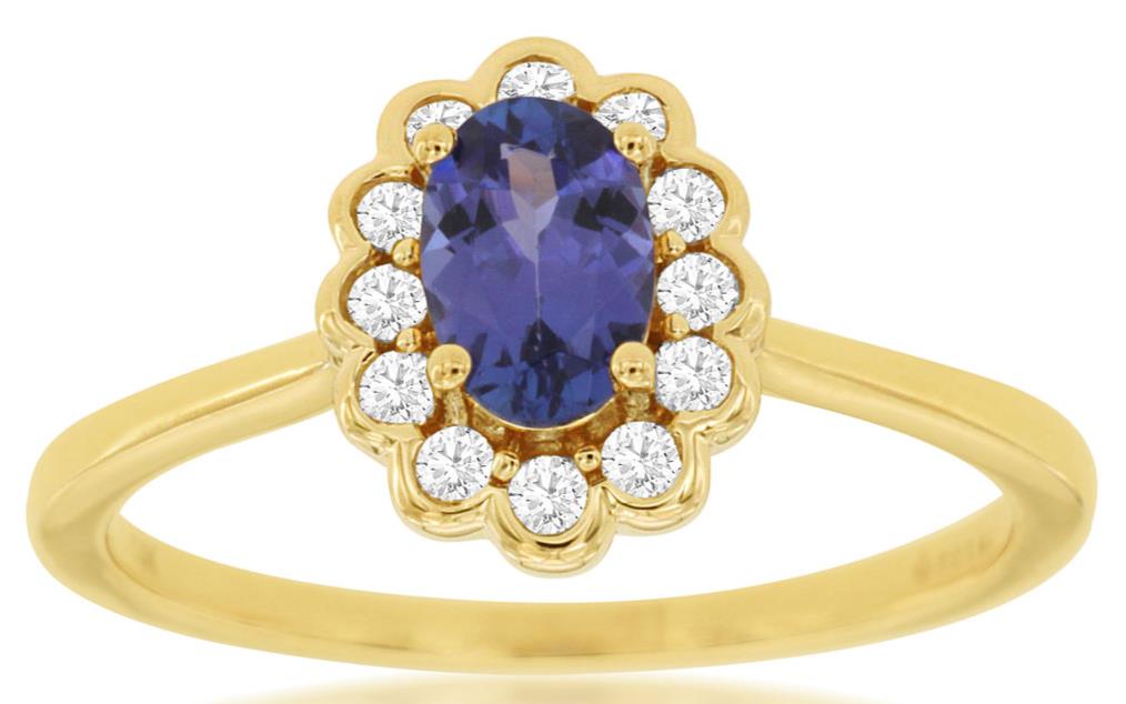 14KT YELLOW GOLD LOVE RING. 3D SEMI BEZEL FLOWER DESIGN. ROUND DIAMONDS ARE F/G COLOR, VSSI CLARITY .16 CARATS. AAA OVAL TANZANITE IS .50 CARATS. RING SIZE 7. CAN BE SIZED BY OUR MASTER JEWELER UPON REQUEST. WRITTEN APPRAISAL AVAILABLE. COMES IN A PRESENTABLE GIFT BOX.