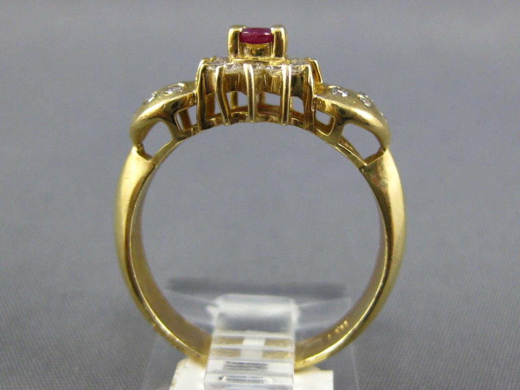 14KT YELLOW GOLD FRIENDSHIP LOVE RING. 3D FLOWER ETOILE DESIGN. ROUND DIAMONDS ARE F/G COLOR, VSSI CLARITY .35 CARATS. AAA OVAL RUBIES ARE .32 CARATS. MEASURES 9mm WIDE. RING SIZE 8. CAN BE SIZED BY OUR MASTER JEWELER UPON REQUEST. WRITTEN APPRAISAL AVAILABLE. COMES IN A PRESENTABLE GIFT BOX.