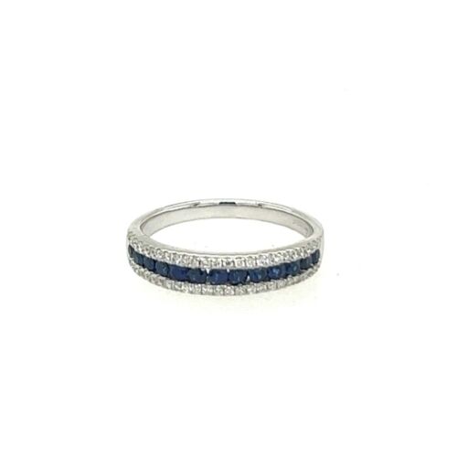 18KT WHITE GOLD WEDDING ANNIVERSARY RING. 3D THREE ROW DESIGN. DIAMONDS ARE F/G COLOR, VSSI CLARITY .20 CARATS. AAA SAPPHIRES ARE .47 CARATS. RING SIZE 7. CAN BE SIZED BY OUR MASTER JEWELER UPON REQUEST. WRITTEN APPRAISAL AVAILABLE. COMES IN A PRESENTABLE GIFT BOX.