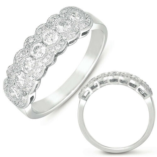 14KT WHITE GOLD ANNIVERSARY RING. 3D THREE ROW SEMI BEZEL FILIGREE MILGRAIN DESIGN. ROUND DIAMONDS ARE F/G COLOR, VSSI CLARITY .68 CARATS. MEASURES 6mm WIDE. RING SIZE 6. CAN BE SIZED BY OUR MASTER JEWELER UPON REQUEST. WRITTEN APPRAISAL AVAILABLE. COMES IN A PRESENTABLE GIFT BOX.