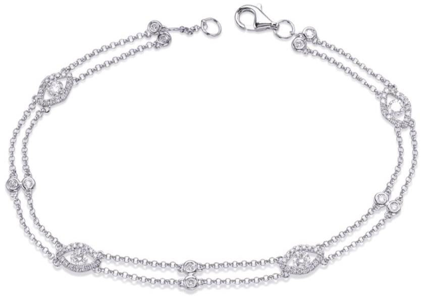 14KT WHITE GOLD LUCKY TENNIS BRACELET. 3D TWO ROW CLASSIC BY THE YARD EVIL EYE DESIGN. DIAMONDS ARE F/G COLOR, VSSI CLARITY .68 CARATS. MEASURES 5mm WIDE. 7" INCHES LONG. WRITTEN APPRAISAL AVAILABLE. COMES IN A PRESENTABLE GIFT BOX.
