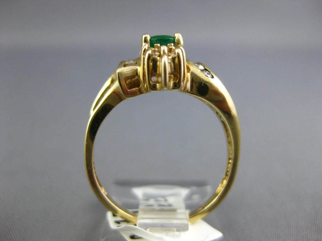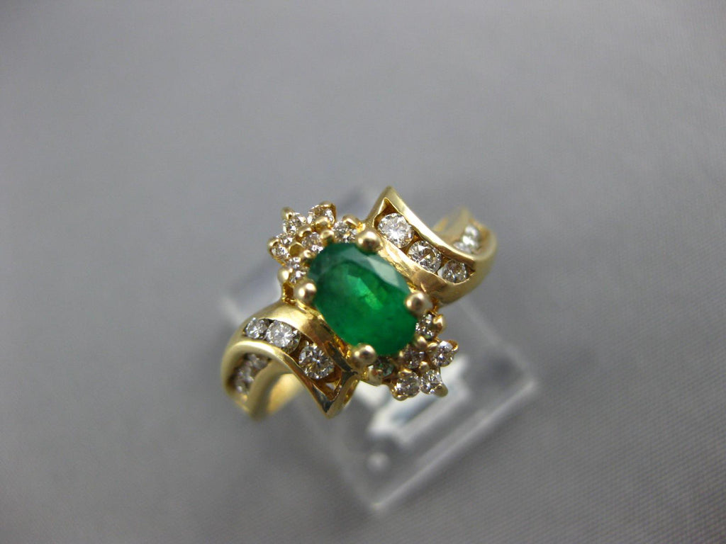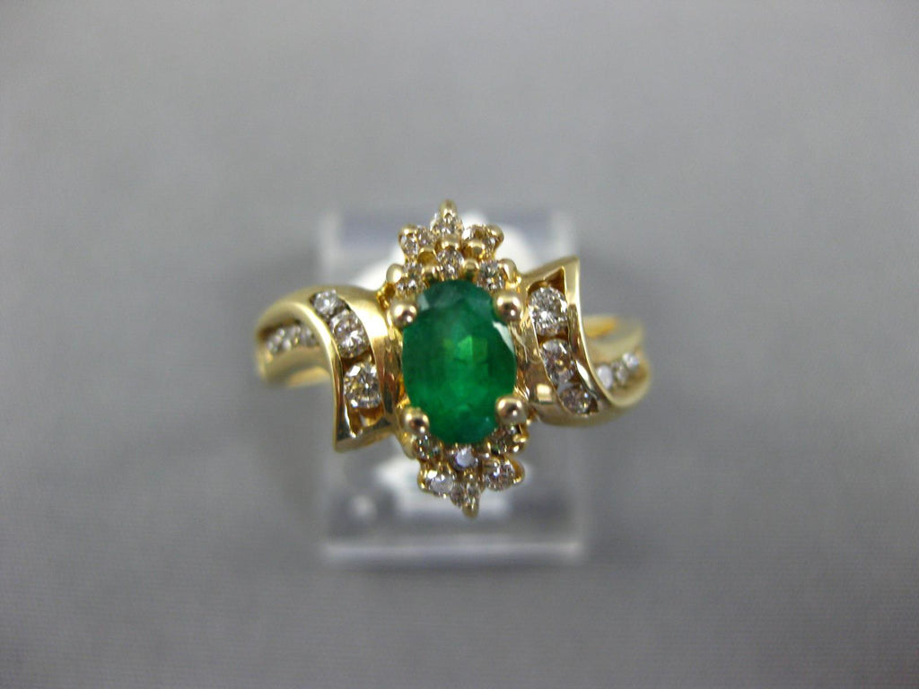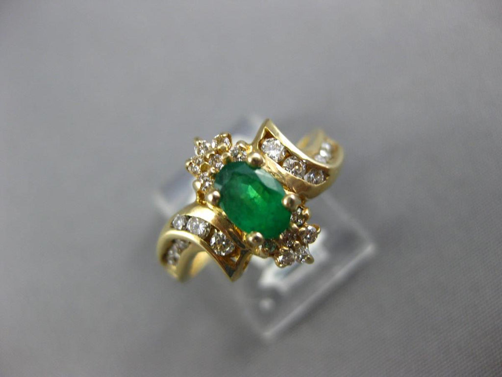 14KT YELLOW GOLD FUN RING. 3D FLOWER SWIRL DESIGN. ROUND DIAMONDS ARE F/G COLOR, VSSI CLARITY .38 CARATS. AAA OVAL EMERALD IS .30 CARATS. MEASURES 13mm WIDE. RING SIZE 7. CAN BE SIZED BY OUR MASTER JEWELER UPON REQUEST. WRITTEN APPRAISAL AVAILABLE. COMES IN A PRESENTABLE GIFT BOX.