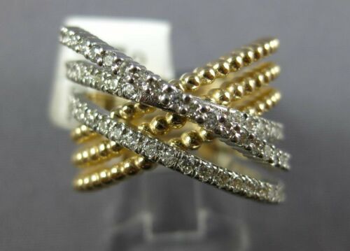 14KT WHITE AND YELLOW GOLD LOVE RING. 3D MULTI ROW CRISS CROSS INFINITY BEADED DESIGN. DIAMONDS ARE F/G COLOR, VSSI CLARITY .69 CARATS. MEASURES 15mm WIDE. RING SIZE 6. CAN BE SIZED BY OUR MASTER JEWELER UPON REQUEST. WRITTEN APPRAISAL AVAILABLE. COMES IN A PRESENTABLE GIFT BOX.