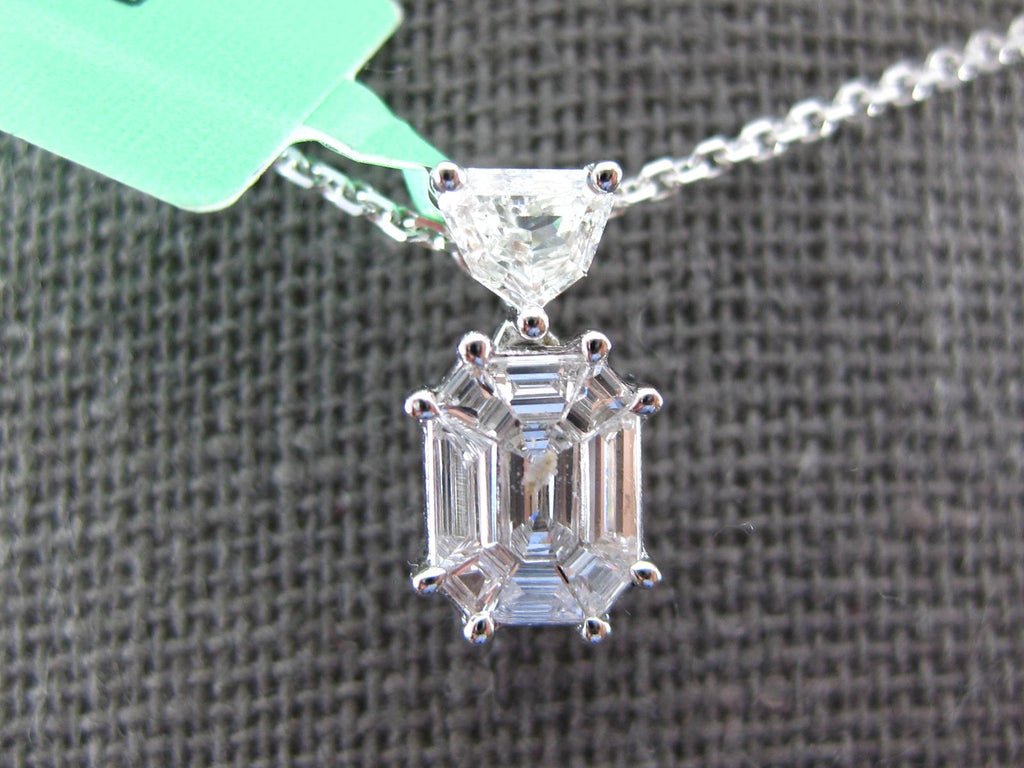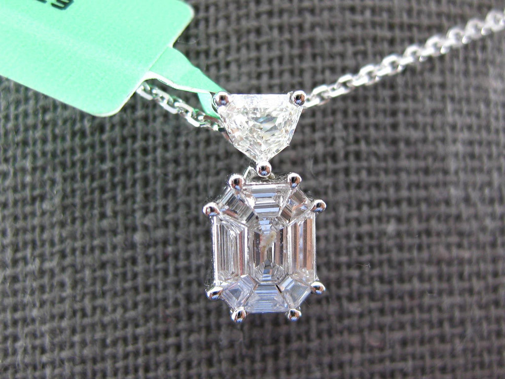 18KT WHITE GOLD FUN FLOATING PENDANT. 3D CLUSTER OCTAGON DESIGN. BAGUETTE AND KITE CUT DIAMONDS ARE F/G COLOR, VS CLARITY .69 CARATS. MEASURES 11mm X 5mm. COMES ON A 14KT GOLD DIAMOND CUT 16" INCH CHAIN. WRITTEN APPRAISAL AVAILABLE. COMES IN A PRESENTABLE GIFT BOX.