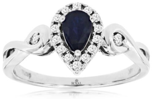 14KT WHITE GOLD LOVE RING. 3D HALO INFINITY DESIGN. ROUND DIAMONDS ARE F/G COLOR, VSSI CLARITY .16 CARATS. AAA PEAR SHAPE SAPPHIRE IS .53 CARATS. RING SIZE 7. CAN BE SIZED BY OUR MASTER JEWELER UPON REQUEST. WRITTEN APPRAISAL AVAILABLE. COMES IN A PRESENTABLE GIFT BOX.